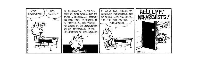 I also think I know a fair amount of stuff. And you’re right there is some stuff that you wish I didn’t know about and it can feel like a burden, but I also appreciate things on a much greater level too. As an atheist who applies no intentionality to the universe I actually find myself much happier since I’ve accepted the universe as being indifferent than purposeful. I find I am much more at peace with even violent crime, knowing that the problem may be genetic coupled with undiagnosed traumatic childhood experiences. That means it’s a problem that has a chance of being solved, instead of “Evil exists and this killer is evil, let’s lock him up or put him in the electric chair.” I don’t know that those who are ignorant of how the world actually works are necessarily less burdened. Sure they maybe more easily entertained, but they can also be more easily stressed, angered or depressed. Maybe easily isn’t the right word. I liken it to be sort of not growing out of that childhood innocence. When you were a child you cried your eyes out when your hot dog fell on the ground, but as you become an adult the things you cry about are a lot more complex. But I don’t know that the sadness of your lost hot dog is any less than when you find out that another shooting happened in an elementary school. I mean any adult can see that one is certainly worse than the other, but I wonder if as individuals at a given age we actually feel very different. I remember spending a week as a young teenager being unhappy because my sister forgot to press record on the VCR for a movie I wanted to watch. I look back right now and think I was really stupid to be sad about that. Ignorant people get upset over pretty stupid things, and are often more easily fooled to become upset about things that they don’t even know much about, but hey getting angry about something feels good. They lose their shit when their favorite crappy show gets canceled, or having a tantrum because Pluto is no longer a planet. So I guess I don’t know that their ignorance is leading to a less burdensome and happier life, just a life where they are going to end up getting emotional about a lot of the wrong things.