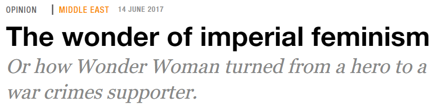 Now you can see the chain of logic here, right? Sure, the Wonder Woman film itself is fine, a positive thing even. But if it supports a set of political beliefs that lead to the harm of others then surely that’s a bad thing, even if it does have some feminist value in itself. And since preventing the deaths of innocents is obviously more important than positive female role models in cinema, then real feminists should reject this movie rather than celebrate it.