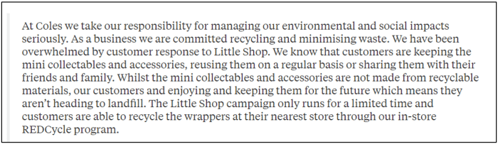 That said the essential arguments I made I feel still stand: I agree that toys and collectables are a core part of childhood and adulthood for that matter as well. That said, toys can be of varying quality, both in their design and their materials – I’d argue that Coles’ decision to make the toys out of unrecycled and unrecyclable plastics is a failure on both counts. I’d also argue that people collecting these specific items – as opposed to any of the other, better designed and more responsible toys on the market – are enabling the environmental impact they cause. While I did argue in the blog (quite strongly) that the toys “aren’t even fun”, I accept that whether a person enjoys a toy or not is entirely subjective and not my place to judge. That said, given that enjoyment is subjective, it can also be changed and I’d suggest that the enthusiasm could be better focused on responsible products that don’t also serve as cheap marketing for a rather nasty corporation which rips of farmers and has significant investments in the gambling industry: https://theconversation.com/coles-wants-1-maximum-bets-for-pokies-so-why-wont-the-pokie-makers-play-ball-70574