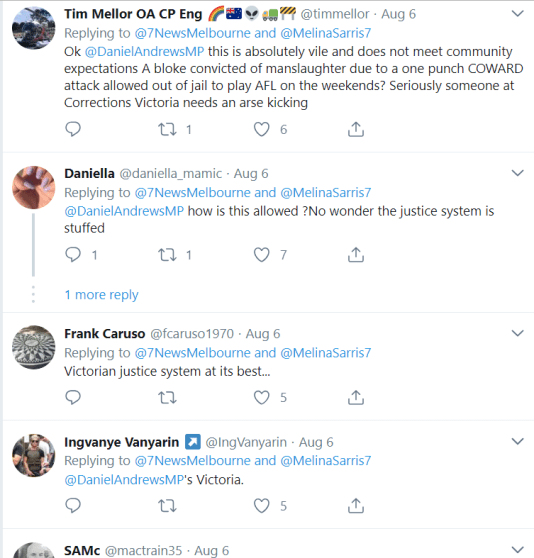 Not a compelling message to encourage rehabilitation you may think. And even worse, consider the message it sends to those who have not yet offended but who might be harbouring a latent desire to start some violence if they get the opportunity – ‘Oh hey you might go to prison if you violently attack, or even KILL another human being, but it’s not that big a deal really. See, we even let you out to play footy on the weekend!’.